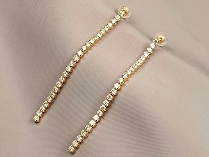 ダイヤモンド同士は丸カンで繋がっておりそれぞれが1石ずつ揺れる様になっています。両方で16石使用しており大変豪華なお作りです。ダイヤの直径は2.7㎜ほどでピアスの全長は25.6㎜ほどです。