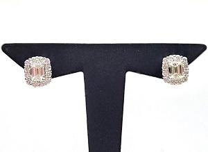 エメラルドカットのペリドットが個性的なピアスです。石の周りに地金を巻いたふせこみも石座がカットを強調しています。