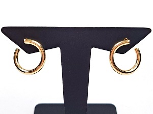 縄目のようなデザインが特徴の中空フープです。下にいくにつれて地金が膨らんでいます。全長は約15㎜ほどで鏡面仕上げです。