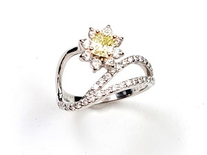 中石のダイヤモンドはマーキースカットと呼ばれる葉っぱ型のカットを施しています。透明感のある澄んだナチュラルイエローダイヤです。