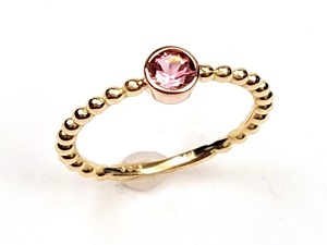 ピンクトルマリンの石座の高さやダイヤモンドの徐々に細くなるラインがデザインのポイントになっておりどの角度から見ても楽しいリングです。